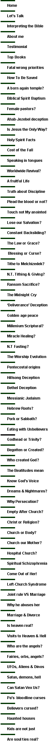 DIFFERENT INTERPRETATIONS OF THE BEING OF THE GOD OF THE BIBLEModulism: This “Oneness” Pentecostal or “Jesus Only” teaching in all its different forms actually excludes the Scriptural God of the Bible: Father, Son, and Holy Spirit, (Mt. 28:18-20.) Modulism or Pentecostal Oneness was/is also taught with different variations by mason and false prophet William Branham; Jehovah’s Witnesses, and Seventh-Day Adventists, although most Adventists now hold to the doctrine of the trinity. [Acknowledgement to especially Wikipedia Encyclopaedia.]As all churches, Modulists mix truth and error to concoct their teachings and confuse their members. So, their teachings are much more complicated than to say they believe that Jesus is the Father and the Holy Spirit. According to their doctrines, I don't think it is possible to understand how they could call themselves “Jesus Only” in the first place. They say, “the word ‘trinity’ is not found in the Bible,” and this is correct. They teach that “God became flesh” or a human being called Jesus “and dwelt among us,” which is true, (Jn. 1:1-18; Heb. 1:1-14.) They also state correctly that God incarnate, or the Man Jesus Christ, is called “The Son of God.” He was born as a complete human being, but He remained fully God at the same time. Ž Then suddenly, Modulists change Jesus The Way into a different ‘mode.’ They call the human man Jesus Christ simply another “manifestation” of God, which is ‘something’ [not Someone] entirely separate from God. William Branham taught, “God manifested Himself in mere titles or names, (or attributes) such as ‘Holy Spirit,’ ‘Father,’ or ‘Christ.’” So why do they call themselves “Jesus Only?” They could just as well have called themselves “Father Only,” which, according to these descriptions of the Son, would have been more logic, although still extremely false. Ž Jesus-Only or Oneness Pentecostalism also alleges, “The Son of God did not exist in a substantial sense prior to the incarnation of Jesus of Nazareth, except as the Logos [Written Word] of God the Father.” Exactly when, in human terms, written Scripture came into being, no one knows. Some believe writing only began when God gave Moses the Old Testament/Covenant Law, engraved in stone. Of course, God only became a physical human being when Jesus was begotten. But Jn. 1:1-14 proclaims, “In the beginning [or from everlasting] was the Word, [Jesus.] And the Word was with God, and the Word was God. He was in the beginning with God. All things were made through Him, and without Him nothing was made that was made… (V. 14,) And the Word became flesh, [fully human,] and dwelt among us, and we beheld His glory [Divinity] as of the Only begotten of the Father, full of grace and truth.” Heb. 1:1-14 states, “...Your throne, O God [Jesus,] is forever and ever… (Verse 10,) You, in the beginning, laid the foundation of the earth, and the heavens are the work of Your hands…” So, from all eternity, Jesus God’s Son has been the Creator God Himself, not only when the written Word (Logos or Scripture) was established, (Jn. 1:1-14; Heb. 1:1-14.) Hence, Heb. 7:3 declares that God Jesus is “without father or mother or genealogy; without beginning of days or end of life.” Ž Jesus-Only expands their strange understanding of God by making Him into “Only one Person with [impersonal] attributes or manifestations such as wind and fire.” If this ‘person’ or god could be Jesus of the Bible, that would annihilate the Father and the Holy Spirit. They allege, it wasn’t God the Holy Spirit Himself Who indwelt believers at Pentecost with the “signs” of wind and fire from that day onwards until “the end of the world,” (Acts Chapter 2; 1 Cor. 6:15-20; Mt. 28:19-20.) As “wind and fire” cannot indwell people, it was actually only God in the “mode” of wind and fire that “came over them” like in the Old Testament Covenant, before the blood atonement of Jesus on Golgotha and before the “Holy Spirit was given,” (Jn. 7:39.) That is why, in their founding movement Pentecostalism, they have continual so-called “outpourings,” “Pentecosts,” or “fillings” with their ‘holy spirit.’ If only believers would read the Bible for themselves! Acts 2:1-4 explain the Holy Spirit’s once-off indwelling of blood-cleansed believers after the cross as follows, “[Before the cross the Spirit was not yet given… Jn. 7:39. But for the first time in all of history, on That Day at Pentecost, He came to indwell His sincere believers in Christ.] There came a sound from heaven, as of a rushing mighty wind, [not wind itself,] and it [the sound] filled the whole house where they were sitting. Then there appeared to them divided tongues as of fire, [a sign of fire not fire itself] and one sat upon each of them. [Thus, from that day on, all true believers, at their acceptance of Jesus or their personal, spiritual rebirth in Him, are indwelt once and for all by the “abiding” Holy Spirit “until the end of the world,”] (1 Jn. 2:20; 27; Mt. 28:18-20.) Modulism or Jesus-Only makes it impossible to understand the contextual, Scriptural truth about the God of the Bible. Some of their teachings seem Scriptural, while they are not. They also make it impossible to understand how, if they really believe that Jesus is God, the Man Jesus was led into the wilderness by “wind,” and how He prayed to wind or fire in Gethsemane, etcetera. How can a mere ‘title or name’ without a character, (an intelligent personality,) or an ‘activity’ such as wind or fire be referred to as “He,” Who speaks and “convicts of sin, righteousness and judgement?” (Jn. 16:8-11.) How can wind or fire be “grieved” and “blasphemed against?” (Eph. 4:30; Mark 3:28-30, KJV; Spirit Filled Bible 1991.) It is clear that their ‘holy spirit’ cannot be The Holy Spirit of the Bible. The Holy Spirit of the Bible i