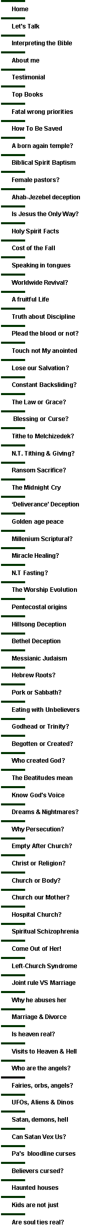 FALSE GIFTS OPERATING AS THE GIFTS OF THE HOLY SPIRIT Testing our own gifts and motives, as well as the gifts, ministry and motives of others in the light of Scripture is another necessary component of our defense against deception. God sends His angels to help and/or warn His believers when we, or our loved ones, are in trouble. It is also Scriptural that angels might appear to us under dire circumstances. What’s more, the Holy Spirit Himself, living inside all true believers, is able to guide us and keep us from all harm, (Ps. 23.) True believers do experience Godly visions and dreams, and the Holy Spirit’s Scriptural gifts of “tongues, divine wisdom, knowledge in Word interpretation, prophecy, the discernment of spirits, and the gift of extraordinary faith to perform healings and miracles,” (1 Cor. 12:4-11.) Nonetheless, believers must be aware of the fact that the devil is able to counterfeit nearly every gift of the Holy Spirit and miracle of Jesus, just as Pharaoh’s magicians were able to imitate nearly every sign of Moses. We should seriously question situations where angels and other apparitions and/or voices constantly guide people in unimportant, everyday matters such as what color shoes to wear, and so on. And we must be extremely skeptical about any gift or miracle which manifests itself through guiding angels, dots or orbs, or any other apparition. As said, we must always test the spirits to see whether they are of God, (1 Ths. 5:21; 1 Jn. 4:1-4.) And we should always allow the conviction of the Holy Spirit, through the contextual truth of Scripture, to ‘be the lamp for our feet’ in the unknown darkness of the spiritual world. Þ Sadly, many false spirits are operating unchecked among the body of Christ. Most believers accept every prophecy, teaching and spiritual manifestation at face value, while God warned in Deut. 28:9-14, “ You will not learn to follow the abominations of [pagans.] There will not be found among you anyone who… practices witchcraft, or a soothsayer, (fortune-teller,) or one who interprets omens, or a sorcerer, or one who conjures spells, or a medium, (who consults spirits,) or a spiritist, (who manifests or ‘channels’ spirits,) or one who calls up the dead. (Such apparitions are in fact evil spirits, masquerading as the spirits of dead people.) For all who do these things is an abomination to the Lord…” According to the context of Scripture, the Spirit doesn’t give us a 'know-all' gift, which enables us to judge every situation instantly or prophecy over every person just by looking at them. That is the false ‘gift’ of divination. Sadly, many such ‘gifted prophets,’ like the well-known Kim Clement, are nothing more than fortune-tellers. (I personally experienced his manipulative techniques to extract information from unsuspecting believers while whispering to them, which he then screams out as revelations from God.) Notwithstanding the fact that most of Clement’s prophecies are extremely false, he also invites incredibly false heresies, chaos, and deceptive spirits to get hold of the thoughts and lives of believers through his ungodly declaration, “We want some unaccountable impulse to come into our services…’ God is not the author of confusion or chaos, but of order, (1 Cor. 14:33.) Such arrogant disobedience to Jesus’ direct commandment to accountability, is rooted in the charismatic declarations of mason Kenneth Copeland, “When I read in the Bible where it says ‘I Am,’ I just smile and say, ‘Yes, I Am too!’” What blasphemy! This means that where Jesus proclaims, “I Am the Resurrection and the Life… I Am the Way, the Truth and the Life… I Am the True Vine… I Am the Good Shepherd…” the false ‘christ’ Kenneth Copeland actually proclaims the same! And Paul Crouch and others confirm, “We’re God, yes, I Am a little God!” (Mt. 18:15-19, 1 Cor. 14:29-33; Mt. 24:5 & 11.) |