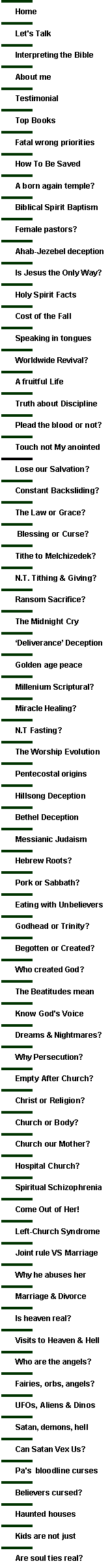 A born again temple of the Holy Spirit? How do we know the Voice of the Holy Spirit? Why arm I still Empty after the Church Sermon? What does Jesus Really Say about a “Worldwide Revival?” Þ Tithing and Excessive Giving is a Dangerous Gospel of Greed Þ How to live fruitful in the Kingdom of Jesus Christ The Great ‘Deliverance’ Deception Come out of her, My people! Church Praise & Worship Versus Scriptural Praise & Worship Þ Worldwide Hillsong Church Deception Þ Did Billy Graham really bring millions of believers to heaven? Þ The Human Sacrifice of the Mary-worshiping, Masonic Protestant Reformers Is it Scriptural to ‘plead the blood of Jesus?’ Extra-Scriptural Revelations of Heaven and Hell — What does Scripture Say? · The Flat Earth Theory, Technology Phobia, and Fear Mongers Kent Hovind and Creation Science preach the Flat Earth and Evolution Theory |