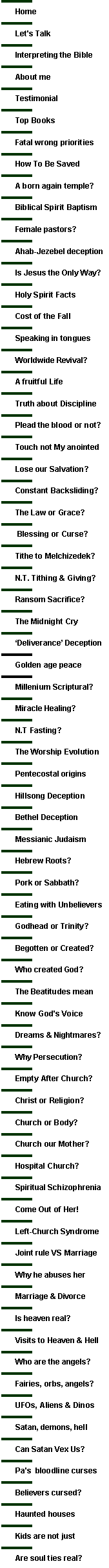 Eating Pork and Keeping the Sabbath? Touch not God’s Anointed — who are you to judge? Þ The Great ‘Deliverance’ Deception Þ Great, Irreconcilable Differences between Psychiatry and Scriptural Truth Þ How to Sever Personal Relationships with Satan Þ The Power of Praise in Deliverance from Affliction · Psychopath Freaks that Deceive and Control us · The struggles of people who were sexually abused are multifold · “Deliver us from evil and Restore our Souls” UNSCRIPTURAL HIERARCHY OF ‘RULING’ ‘ELDERS’ The Dreadful Consequences of the Fall in Eden Did God change His Marriage Covenant so we may Divorce at will? GOD’S UNIVERSAL AND SPECIFIC PLAN FOR MARRIAGE PARTNERS ABUSE WAS NOT EVE’S PUNISHMENT THE TWO-PHASE WEDDING CEREMONY AND “LIVING TOGETHER — ‘MARRIED IN GOD’S EYES?’
