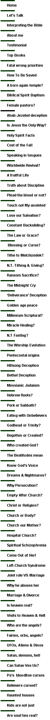 UNSCRIPTURAL HIERARCHY OF ‘RULING’ ‘ELDERS’ The Dreadful Consequences of the Fall in Eden Did God change His Marriage Covenant so we may Divorce at will? GOD’S UNIVERSAL AND SPECIFIC PLAN FOR MARRIAGE PARTNERS ABUSE WAS NOT EVE’S PUNISHMENT THE TWO-PHASE WEDDING CEREMONY AND “LIVING TOGETHER — ‘MARRIED IN GOD’S EYES?’