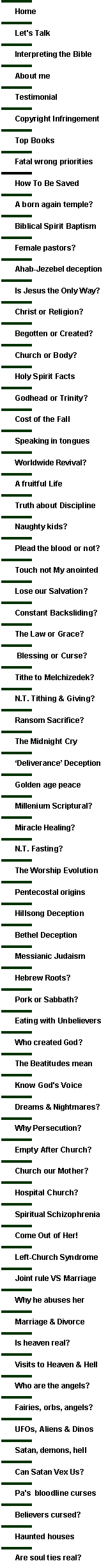 After that, everyone is born in that position of utter darkness outside God’s spiritual life, (Rom. 5:12 KJV; 1 Jn. 5:19; 1 Pt. 2:9-10.) Since the fall in Eden, cut off from God The Spirit, humans could NOT enter into His Holy Presence or have a relationship with Him, (Gen. 3:24.) So, they hid from Him to continue their sinful deeds in underhandedness, (Gen. 3:9-10.) What’s more, that day in the garden when humanity lost their spiritual place in God’s holy presence, (Genesis 3:23-24,) He cursed the ground, (not them,) to bring forth thorns and thistles. This means, their blessed life became extremely difficult on a multilevel. Creation too, still severely suffer the consequences of that curse, (Rom. 8:20.) Even the superrich and those that seem happy and healthy, also live in that state of lostness and CURSEDNESS without God the Spirit, (Galatians 3:10-18.) Even so, God wanted humanity to regain their personal relationship with Him, (Gen. 3:15.) He did not want them to worship Him from far away in outward religious structures like the old Israeli temple, which was governed by worthless religious rituals, ceremonies, and sacraments as we see in the Old Testament covenant, (Heb. 9:8-15; 10:1-7! Acts 7:44-50.) · The Lord Jesus Christ confirmed this when He said to Nicodemus and to the woman at the well in John 3:3-5 and 4:21-24, “UNLESS ONE IS [spiritually] BORN AGAIN FROM WATER, [not ‘sacramental,’ ‘saving’ baptism, but through the truth of God’s Word: 1 Pt. 1:23,] AND THE [power of the] HOLY SPIRIT, HE CANNOT SEE, [understand,] OR ENTER THE KINGDOM OF GOD... [After the cross and Pentecost,] YOU WILL WORSHIP NEITHER ON THIS MOUNTAIN, [this denomination or the ousted religion of Judaism, Hebrews 8:7,13,] NOR IN JERUSALEM, [some ‘holy place or holy land,’] BUT TRUE WORSHIPPERS WILL WORSHIP THE FATHER IN SPIRIT AND IN TRUTH, [in a perfect relationship with Him as Adam and Eve did before the fall: Jn. 14:5-11.] GOD IS SPIRIT, AND THOSE WHO WORSHIP HIM MUST WORSHIP IN [their born again] SPIRITS AND IN THE TRUTH [of My Word,]” (Mt. 19:28-30, Acts 2!) Church and sacraments have nothing to do with real, Scriptural salvation, redemption, and blessing in Jesus Christ, which is solely between God and true believers, (Jn. 3:16-18.) To be spiritually born again as the Lord Jesus commanded, everyone needs to understand Who the Lord Jesus Christ really Is. John 1:1-3,14, stated, “In the beginning was The Word, and The Word was with God, and the Word was God. He was in the beginning with God. All things were made through Him, and without Him nothing was made that were made… And The Word became flesh, [a mere human being born from the Hebrew nation,] and dwelt among [them,] and [they] beheld His glory as the only Begotten of the Father [in heaven,] full of grace and Truth… [Verse 5,] And [Jesus The Light] shone in the [spiritual] darkness [of this dimension,] but [those who chose to live in darkness] did not comprehend it.” The Lord Jesus Christ, (God in the body of a mere man,) “Is the Image of the invisible God… For by Him all things were created that are in heaven and on earth; both visible and invisible...” (Col. 1:15-16; Heb. 1:1-14.) Why did God become a mere man? “To deliver [all true believers worldwide, Jews included,] from the power of [spiritual] darkness [or deception that rule the minds of all people since the fall in the garden,] to convey [or spiritually transfer] them [FROM spiritual darkness] INTO the Kingdom of [the Lord Jesus Christ,]” (Col. 1:13.) Therefore, “God SO loved the [whole] world that He gave His only begotten Son, [Jesus the Christ,] that whoever, [Gentiles as well as Jews, who sincerely and personally] believe in Him, should NOT perish but have everlasting life. [Verse 18,] He who believes, [accepts, trusts in, relies on, and follows Him,] is NOT condemned. But he who does NOT believe is condemned already, because he has not believed in the Name of [Jesus;] the only begotten Son of God.” What did the Lord Jesus Christ come to do on earth? No amount of ‘good’ religious works, (so-called ‘saving’ church legalism/sacramentalism,) or any type of church membership can replace or add to the all-sufficient atonement of the Lord Jesus Christ; the Only Redeemer, Savior, and Blessor of all sincerely believing humanity, (Heb. 1:1-14.) Jesus Christ came to FULFILL the entire Law; and to suffer, die, and be resurrected from the dead for every one of our trespasses of the Law, as well as for all the consequences we experience as a result, (Mt. 17-20; Jn. 3:16-18; Isaiah 53:3-6! Jn. 19:28-30; Gal. 3:10-14 KJV.) Therefore, Jesus the Redeemer, Savior, and Blessor became the One and Only New Testament Covenant “Lamb of God, Who takes away the sin of the [whole believing] world!” (Jn. 1:29.) For “In Him we have [present tense] the [full spiritual] redemption through His blood [atonement in our place, which is] the forgiveness of our sins, according to His grace, (Eph. 1:7.)”
